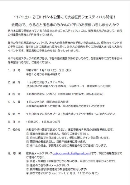 今年も「渋谷フェスティバル」(11月1日(土)・2日(日))に玉名市役所のブースが出店します。昨年から在京玉高会のメンバーがみかん販売のお手伝いをしています。